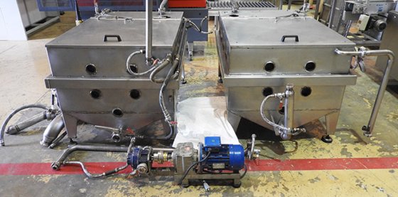 一套两个用于融化巧克力的容器,采用热流体循环夹套加热系统。带顶盖和底部出料口。